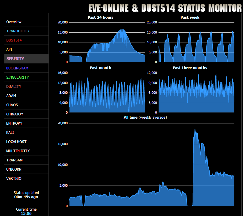I think the reason we have seen a plateau in the weekly average of concurrent logins for the past few years is that the size of the pool of potential EVE players has stopped appreciably growing. Having been around for ten years, there are no new markets or demographics or interest groups to target. We’ve got the attention of the Sci-fi Spaceship Hard MMO players that exists already.