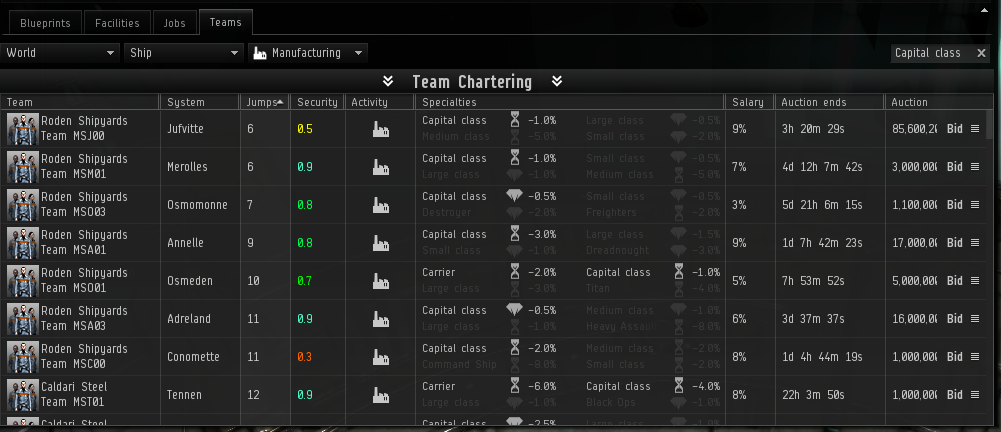 I was playing with the industrial changes and explored the teams interface. I figured out the difference between teams already at work and teams up for auction, saw how to bid on them (not a fan that you *have* to hit enter after typing a solar system name, but not a big deal), and decided to throw a bid on a team as an experiment.