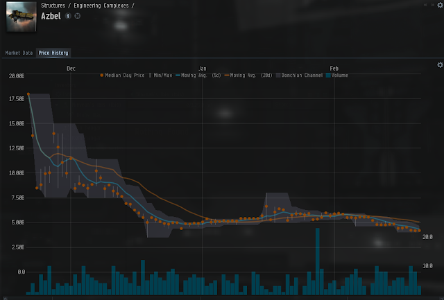 The supply has continued to increase as more producers came online, and I’m willing to bet demand cluster wide has dropped as the number of corporations looking to own an Azbel for their needs have purchased them already; unlike citadels there is not a low level constant need for them as forward operating bases. Couple that with new producers making use of the material reduction bonuses of Engineering Complexes in null sec and low sec and we can see why the price continues to fall.